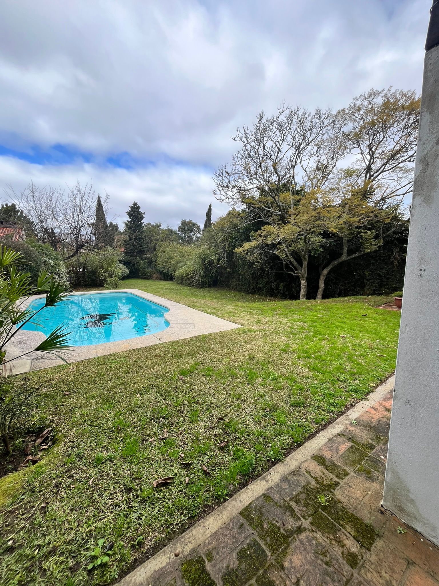 Gran jardín al frente, con rejas y espectacular fondo con piscina, parrillero techado y deposito.