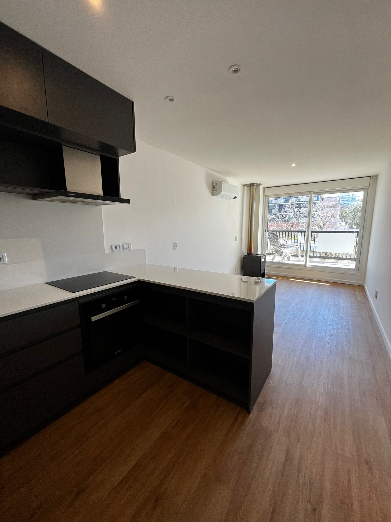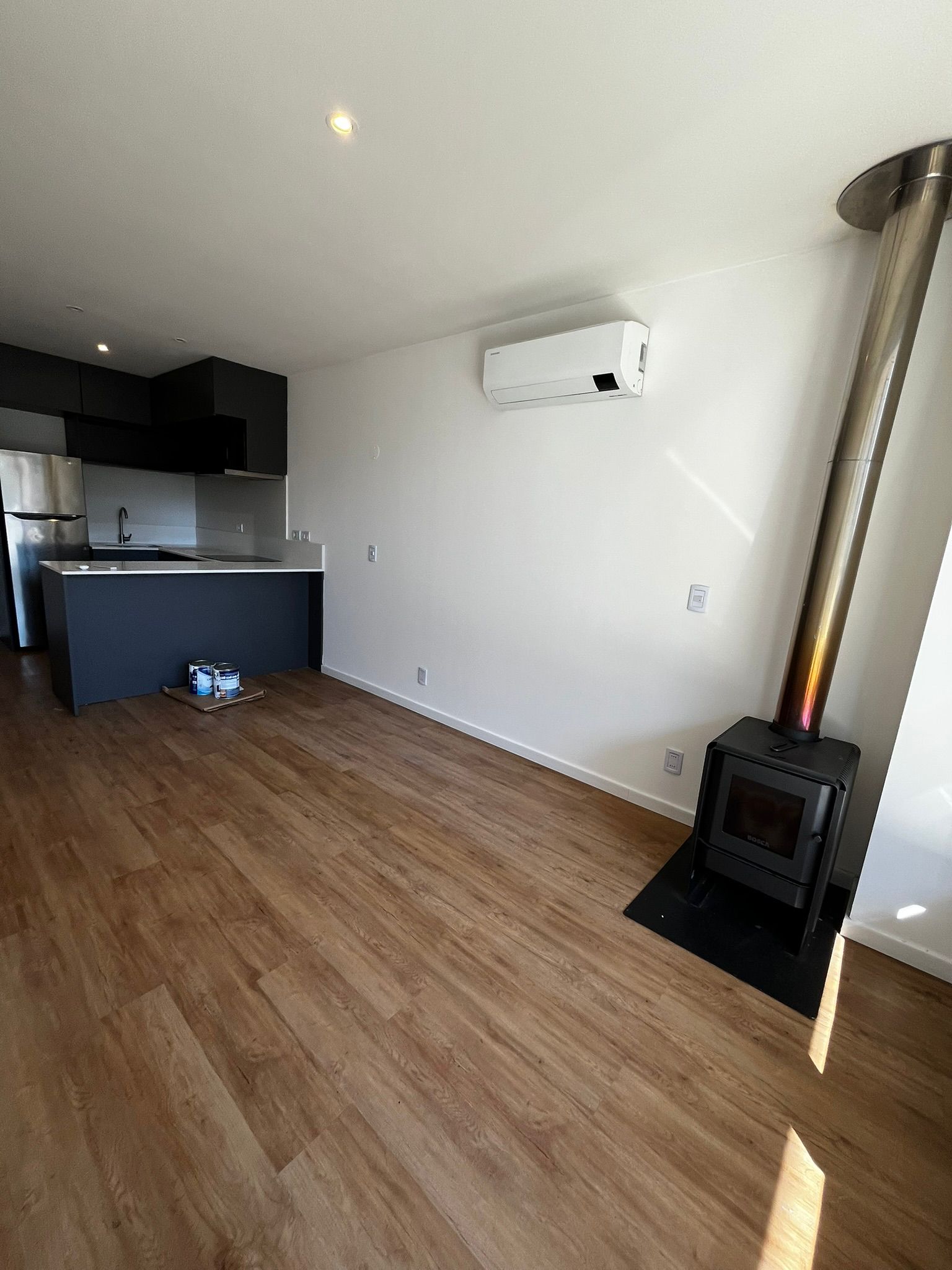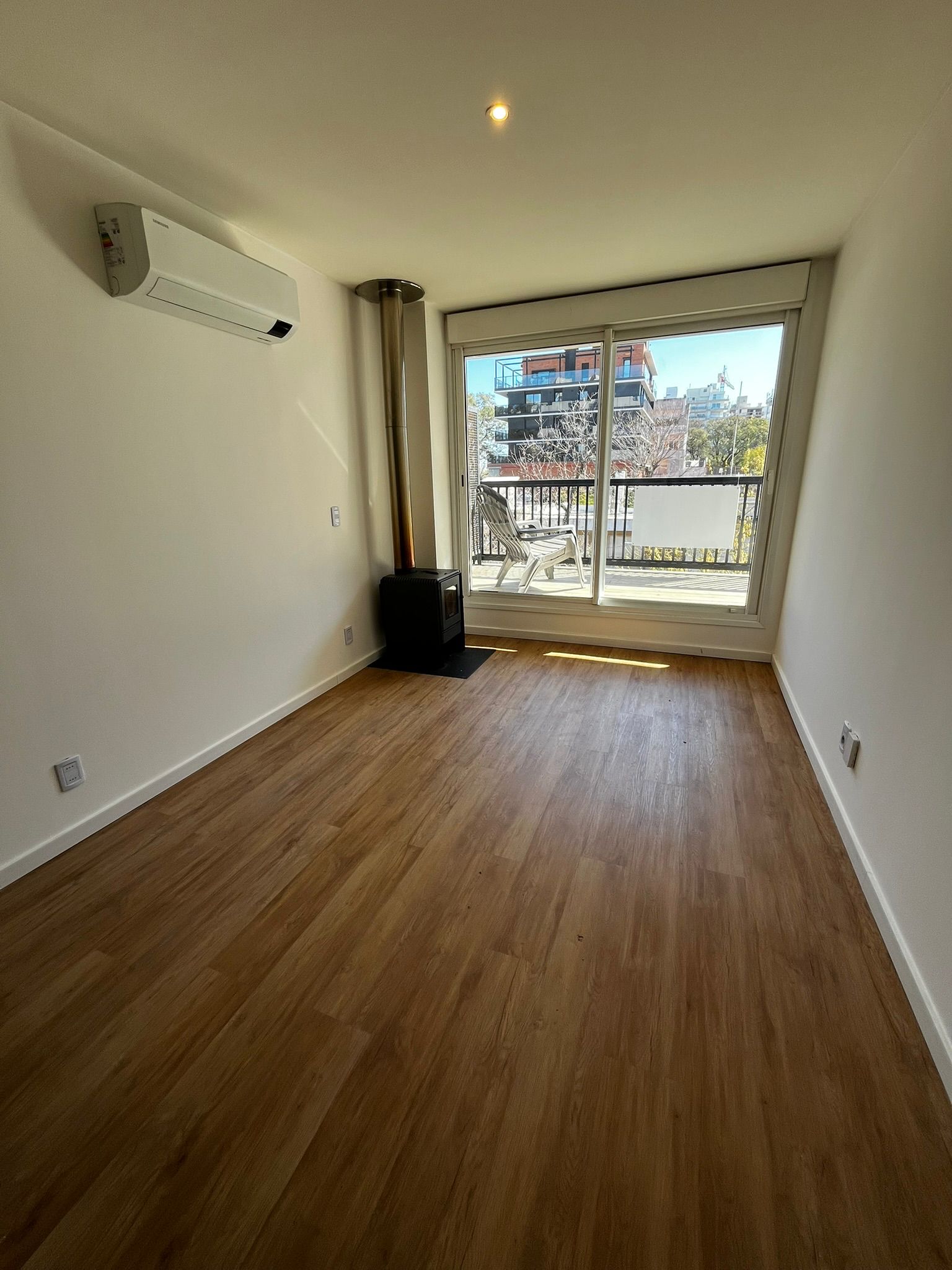 - Living comedor con estufa a leña y aire acondicionado.